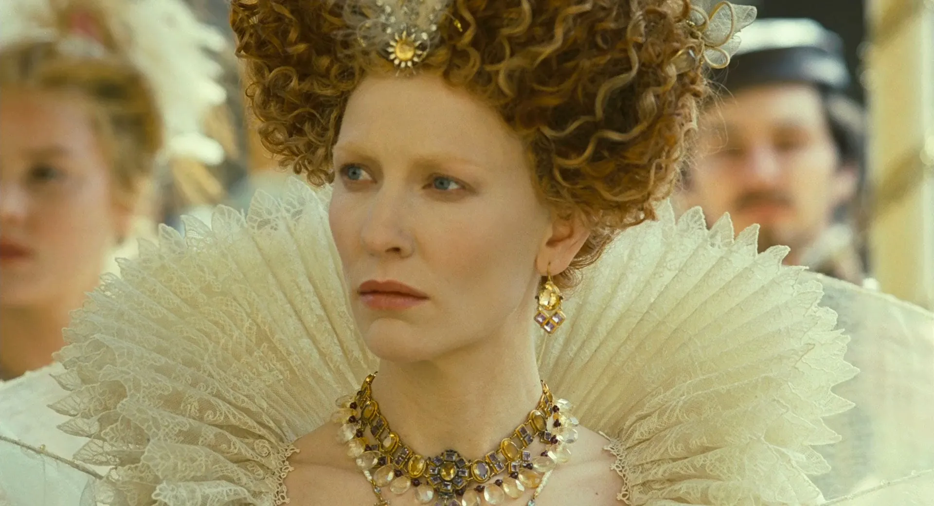 Cast: Cate Blanchett as Elizabeth I, Clive Owen as Sir Walter Raleigh, Geoffrey Rush as Sir Francis Walsingham, Laurence Fox as Sir Christopher Hatton, Tom Hollander as Amyas Paulet, Abbie Cornish as Elizabeth Throckmorton, Rhys Ifans as Robert Reston, Jordi Mollà as Philip II, Samantha Morton as Queen Mary, Eddie Redmayne as Anthony Babington, Adrian Scarborough as Calley, Adam Godley as William Walsingham, Christian Brassington as Archduke Charles, Robert Cambrinus as Count Georg von Helfenstein, David Threlfall as Dr. John Dee, Vidal Sancho as Spanish Minister, Kelly Hunter as Ursula Walsingham, John Shrapnel as Lord Howard, Sam Spruell as Torturer, David Sterne as Cellarman, David Robb as Admiral Sir William Winter, Jonathan Bailey as Courtier, Steve Lately as Walsingham's Servant, Kate Fleetwood as Woman with Baby, Aimee King as Infanta, Susan Lynch as Annette, Kristin Coulter Smith as Mary Walsingham, Hayley Burroughs as Queen Elizabeth's Waiting Lady #1, Kirsty McKay as Queen Elizabeth's Waiting Lady #2, Lucia Ruck Keene as Queen Elizabeth's Waiting Lady #3, Lucienne Venisse-Back as Queen Elizabeth's Waiting Lady #4, Elise McCave as Laundry Woman, Penelope McGhie as Margaret, Coral Beed as First Court Lady, Rosalind Halstead as Second Court Lady, Steven Loton as Manteo, Martin Baron as Wanchese, David Armand as Walsingham's Agent, Steven Robertson as Francis Throckmorton, Jeremy Barker as Ramsey, George Innes as Burton, Kirstin Smith as Mary Walsingham, Tim Preece as Old Throckmorton, Benjamin May as Dance Master, Glenn Doherty as Royal Servant, Chris Brailsford as Dean of Peterborough, Dave Legeno as Executioner, Antony Carrick as Spanish Archbishop, John Atterbury as Marriage Priest, Alex Giannini as First Spanish Officer, Joe Ferrara as Second Spanish Officer, Alexander Barnes as Courtier, Charles Bruce as Courtier, Jeremy Cracknell as Courtier, Benedict Green as Courtier, Adam Smith as Courtier, Simon Stratton as Courtier, Crispin Swayne as Courtier, Kitty Fox as Mary Stuart's Lady in Waiting, Kate Lindesay as Mary Stuart's Lady in Waiting, Katherine Templar as Mary Stuart's Lady in Waiting, Morne Botes as Courtier (uncredited), James Fiddy as Nobleman (uncredited), Finn Morrell as Young Boy (uncredited), Shane Nolan as Tyger Salior (uncredited)